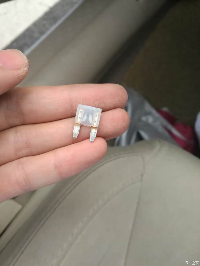 打开主驾驶腿边保险丝盒,对照说明,拔出车辆控制器保险丝,发现该保险丝已经挂掉。