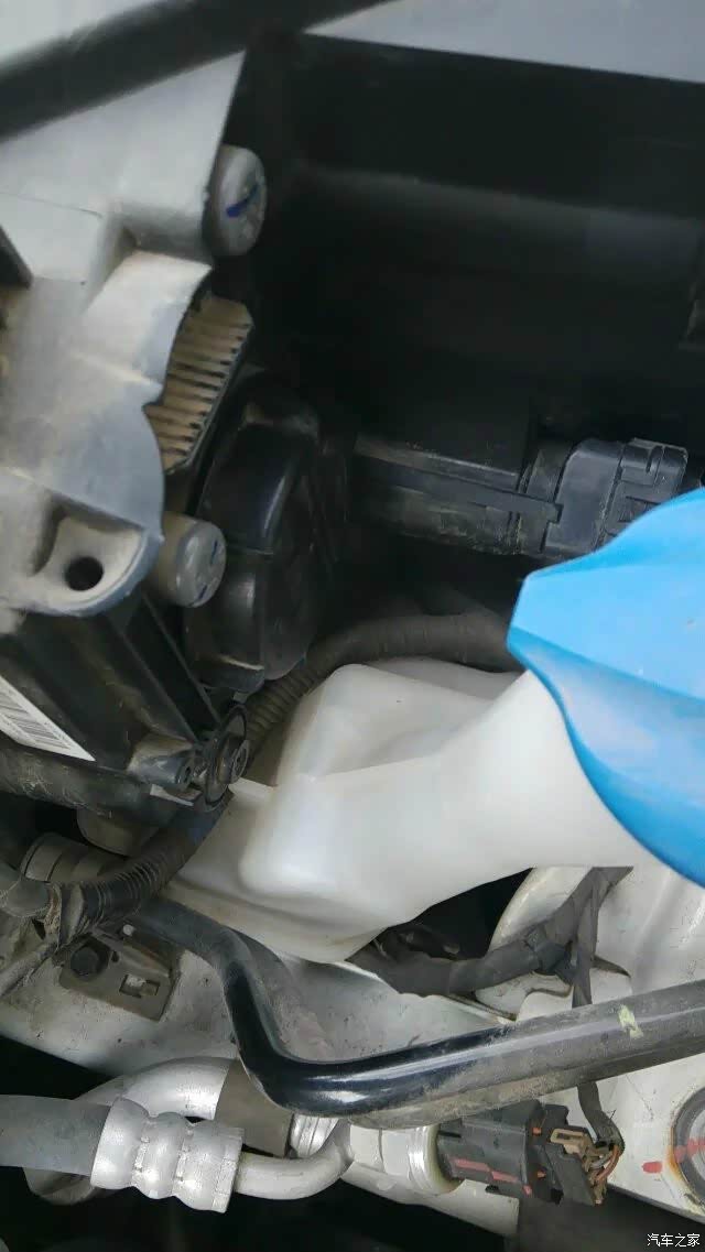 右侧大灯盖,逆时针拧开。蓝色的是玻璃水壶。右侧的空间大,很好换。
