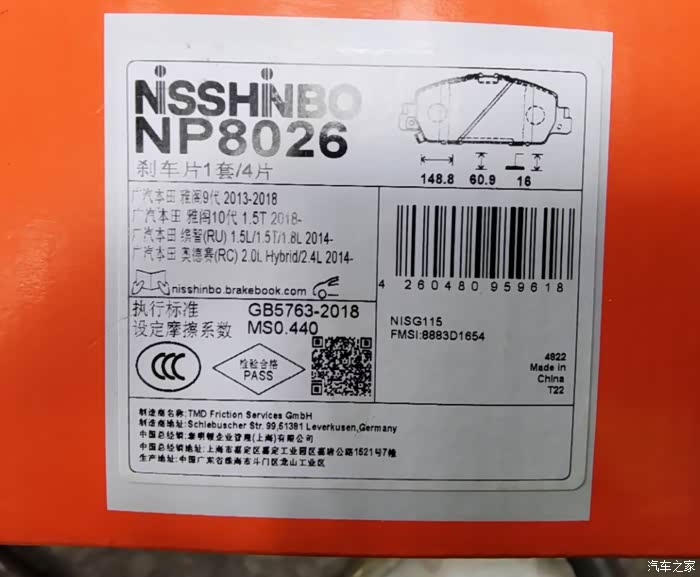 本来想用博世的,但发现博世的摩擦系数稍微低了一些,而且检查了博世的,个人觉得偏硬(刹车盘会稍微多磨一些),所以换成了日清纺的。