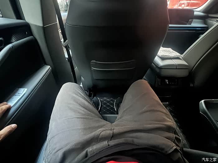 这是二排调到后,我坐在最后排的状态,膝盖刚好抵住靠背,但往前调整些还是很不错的空间了,像我这样个子的真是足够坐了,小孩就随便坐了,只是坐垫没有前面的软,比起汉兰达要软多了,这个可以自己去实车体验,第三排准备买个坐垫铺上去应该就会好很多