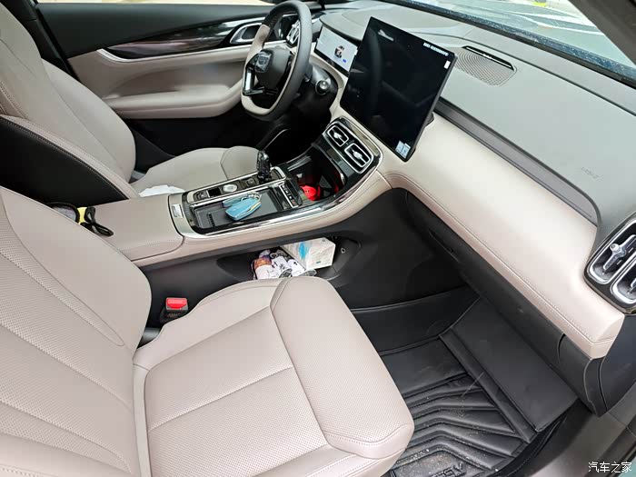 车内的家用感藏在细节里,储物空间设计得很贴心。主驾门板储物槽深度刚好,我的500ml保温杯和娃的350ml吸管杯放进去不晃不洒,开车时拿取特别方便,放完还能有不少的剩余空间。