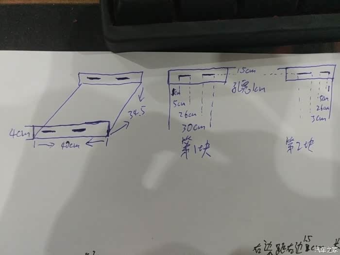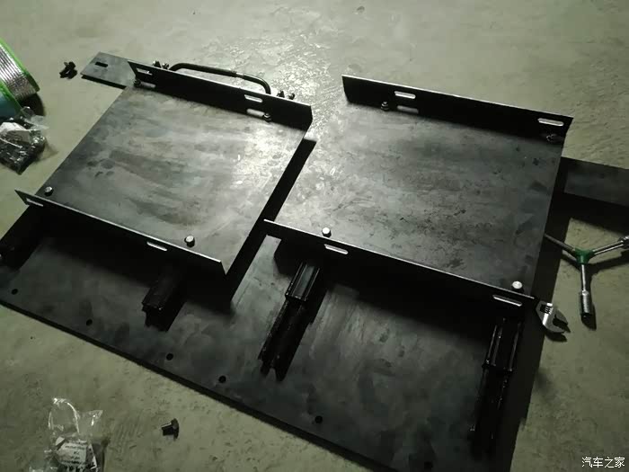 5、胜达的地板凹凸不平想把滑道装平很难,就想到先用钢板将地板铺平。最开始是想用不锈钢板,发现有点贵,最后选择了普通钢板再贴膜防锈。不锈钢板价格大概是普通钢板的两倍,这块失误了,因为用钢板再贴膜防锈一共也就省了200块左右,还不如不锈钢板漂亮。用的是3mm后的钢板,硬度还可以,如果再改我会用4mm的。但是也增重了不是,整个改装完车大概增重了40kG,主要是钢板的重量。画图纸确实是个细活,如果是批量生产的肯定很好画,这单独一个确实要很认真很细,所有孔位、尺寸都要预留好,如何安装也要提前设计好。