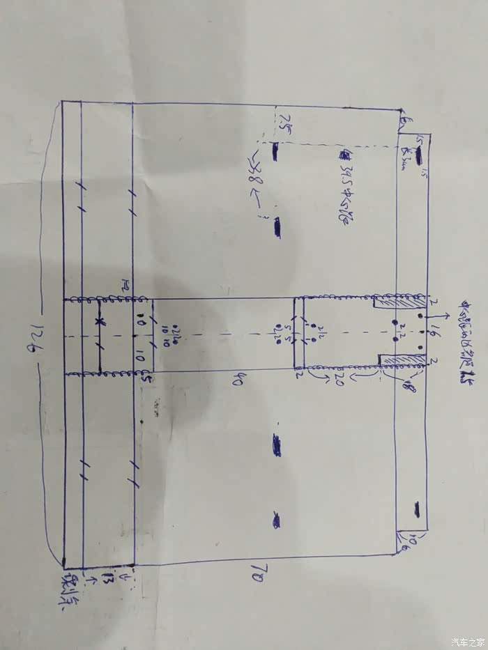 6、量地板的尺寸,尽量使用原车的螺丝孔,画好图纸,交给工厂切割。真的想不到这么方便,这种零散的配件也可切,真的大大解放了我们的想象力,以后想做什么都可以做了。当然由于我不是专业测量的,做出来的尺寸和孔位与实际车有一些差距,这就需要角磨机和电钻再去一点点的修直到合适位置。这块工作消耗了大量的时间。钢板与地板要一致,钢板还要与滑道的孔位一致,滑道要与支架的孔位一致,支架要与座椅孔位一致。最烦人的是底盘正中间有一块凸起,应该差速器的位置。好的是左右孔位基本对称的。