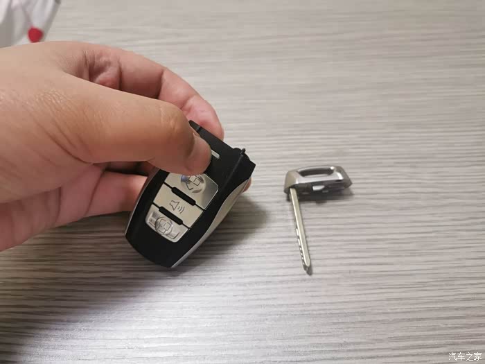 第2步,把机械钥匙取出来,在智能钥匙上面有一个银色的窄条,向下按压,往上拔就能取出机械钥匙。