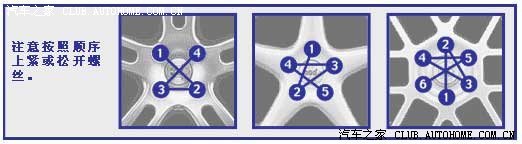上轮毂螺丝的方法,我想很多人都知道,但也有人不清楚,所以我在这里讲一下。无论是拧紧还是松开轮毂螺丝,都有一个专门的顺序,这个顺序是为了保证轮毂被紧紧的锁在车上,具体的原理大家照样做一次就明白,我就不多废话了。