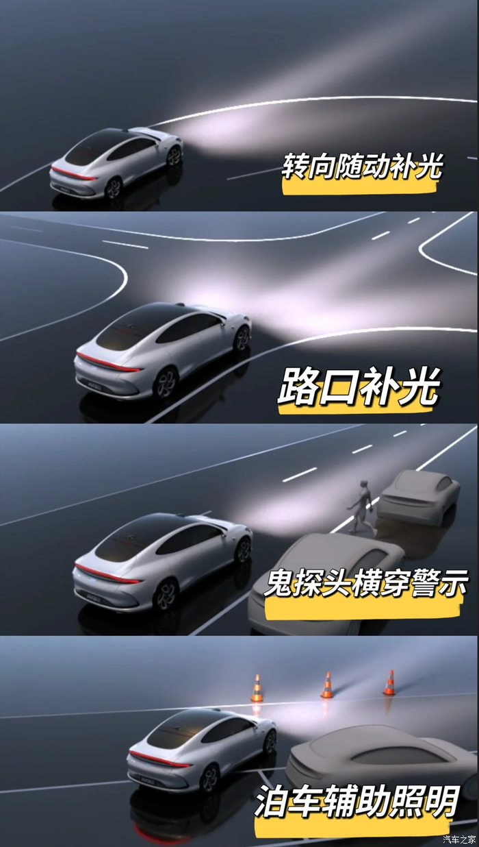 2、 两侧增加了智慧角灯,可以实现转向补光,路口补忙,行人鬼探头闪灯提醒,泊车辅助补光,更具人性化,相对实用。