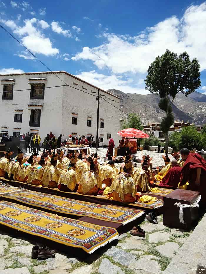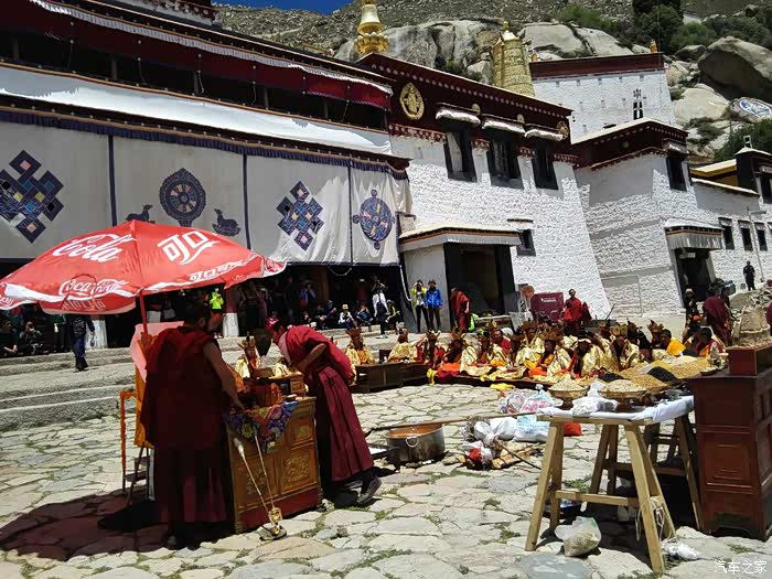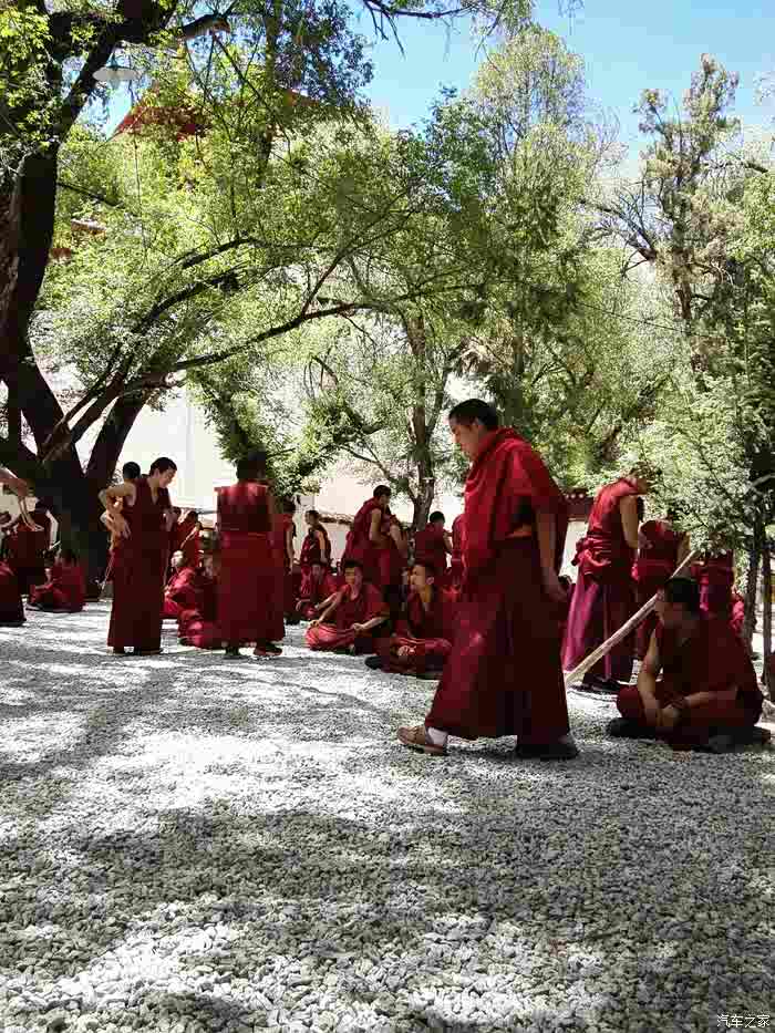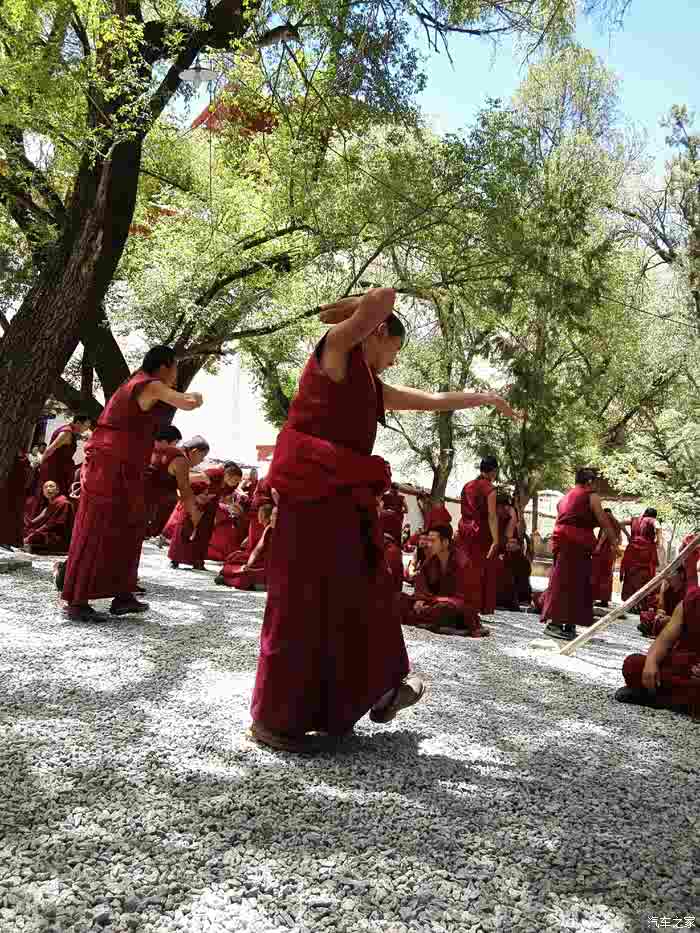 我们很幸运,进门就在一寺院前看到一年只有两次的大型祈福仪式。一群喇叭在年老主持带领下颂经祈福。许多信徒五体投地的叩拜。色拉寺除去寺院里面珍藏的那些宝贝,大家对色拉寺的最感兴趣的就是辩经了。这里每天下午三点到五点是辩经时间,也就是他们的课堂,这个像极了我们的辩论赛。辨经非常激烈,用的全是藏语,我们完全听不懂,雾里看花,呵呵,感觉要打起来了。