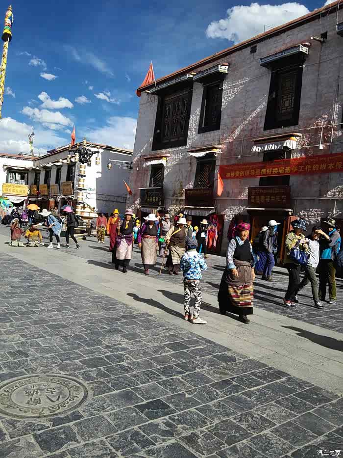 朝拜者在小孩鼻子上涂上碳灰出了寺院,我们来到“八廓古城”,也要安检。八廓街引又名八角街,位于拉萨市旧城区,是拉萨著名的转经道和商业中心,较完整地保存了古城的传统面貌和居住方式。八廓街原街道只是单一围绕大昭寺的转经道,藏族人称为“圣路”。 八廓街其实特别有味道,他有别于江南的婉约轻柔,有别于京城的雄壮有力,无数的藏人每天沿着八廓街,绕行大昭寺,绕一大圈近2公里。现在游客基本也会跟着绕。我们也走走。有人说它是一首缠绵的古诗,在暮色中低吟着往日的旧事,有人说它像一幅精美的壁画,轻描淡写,却抒尽人间风华。