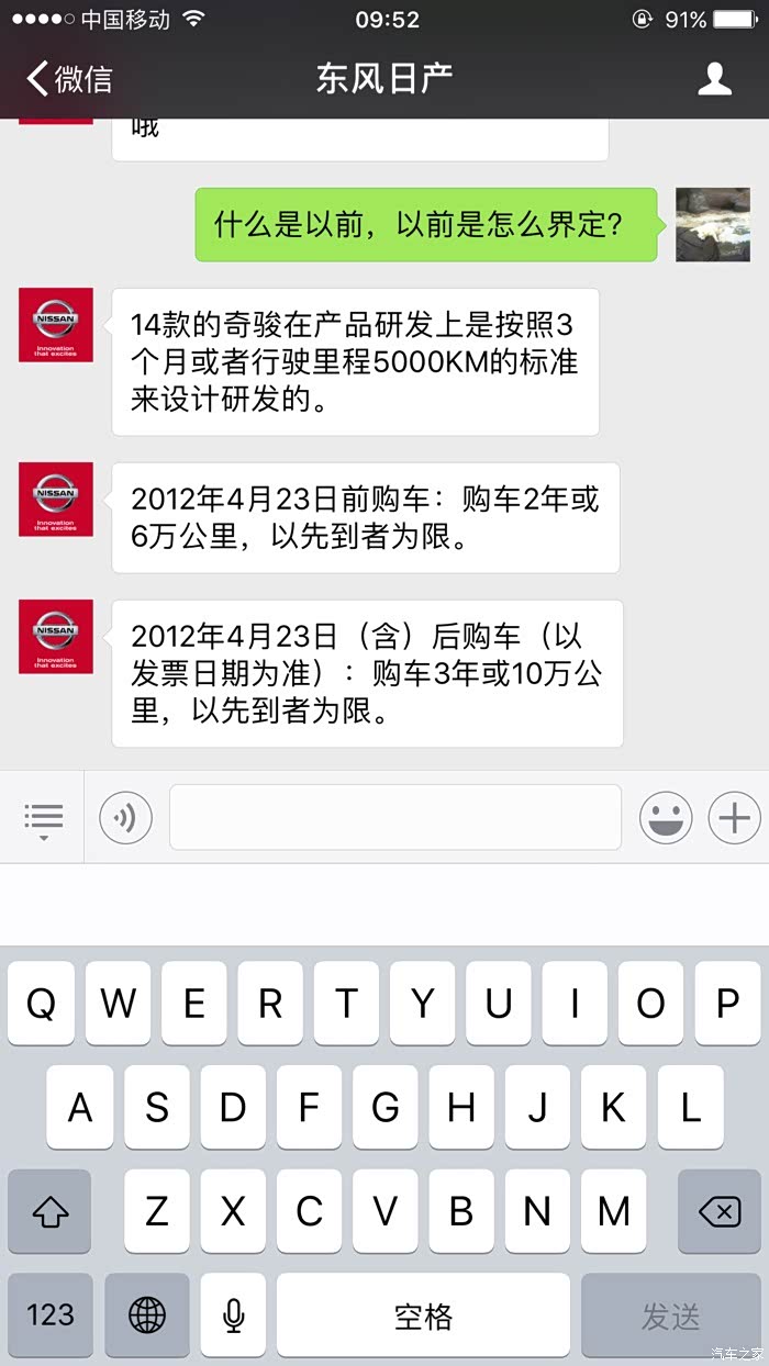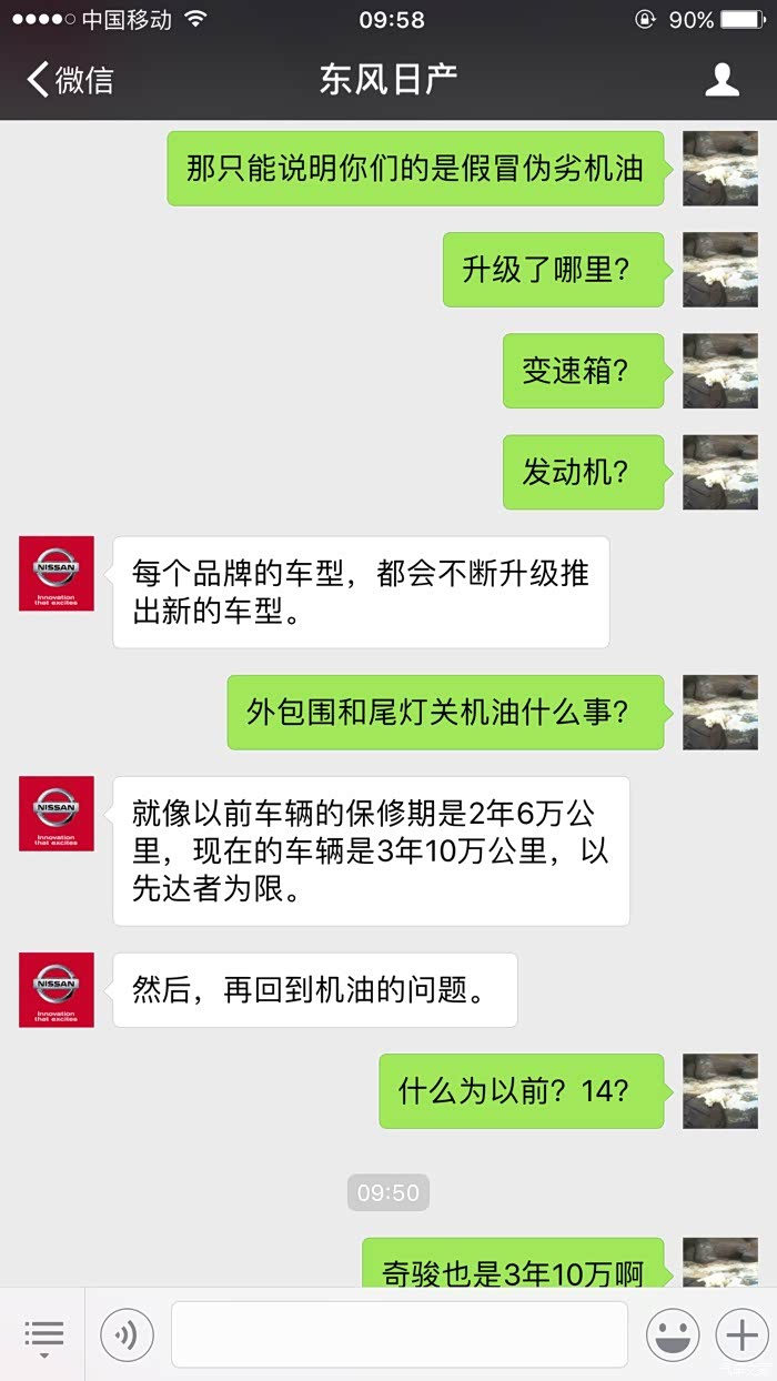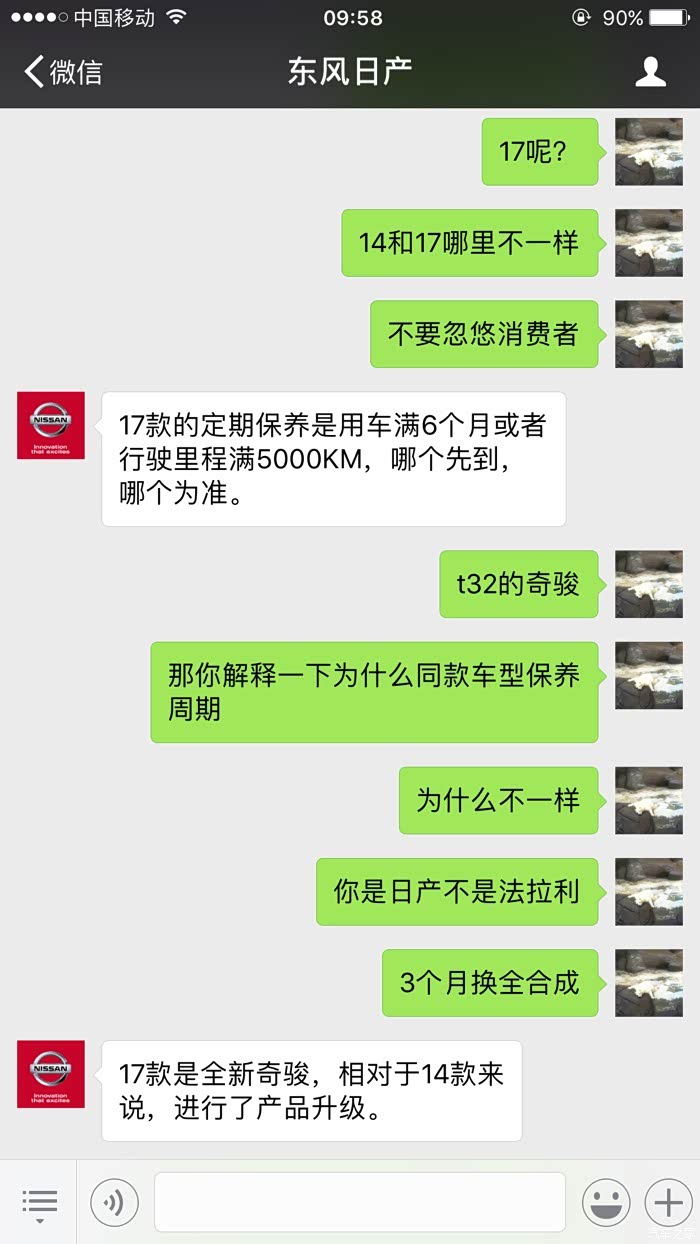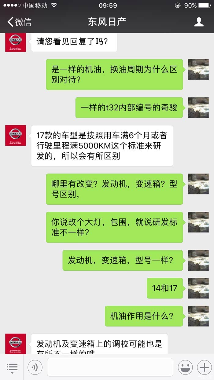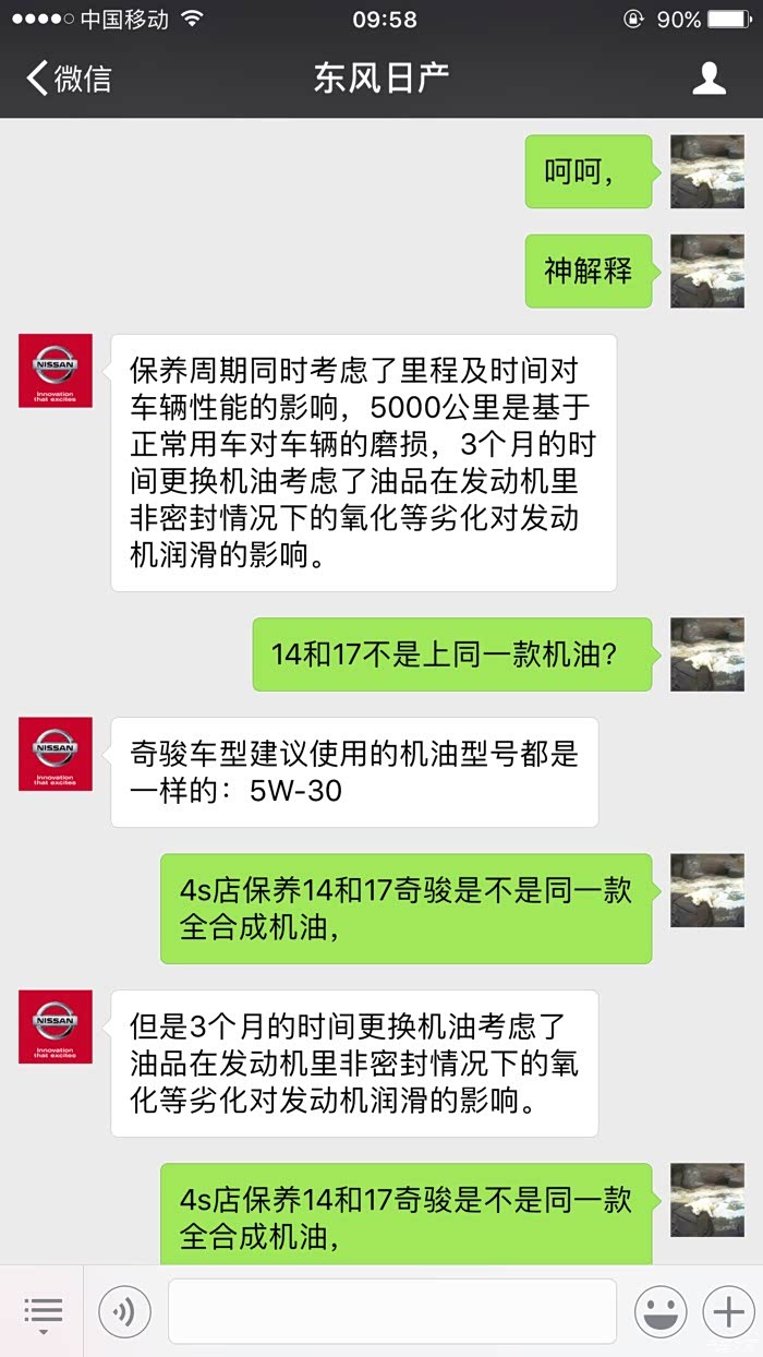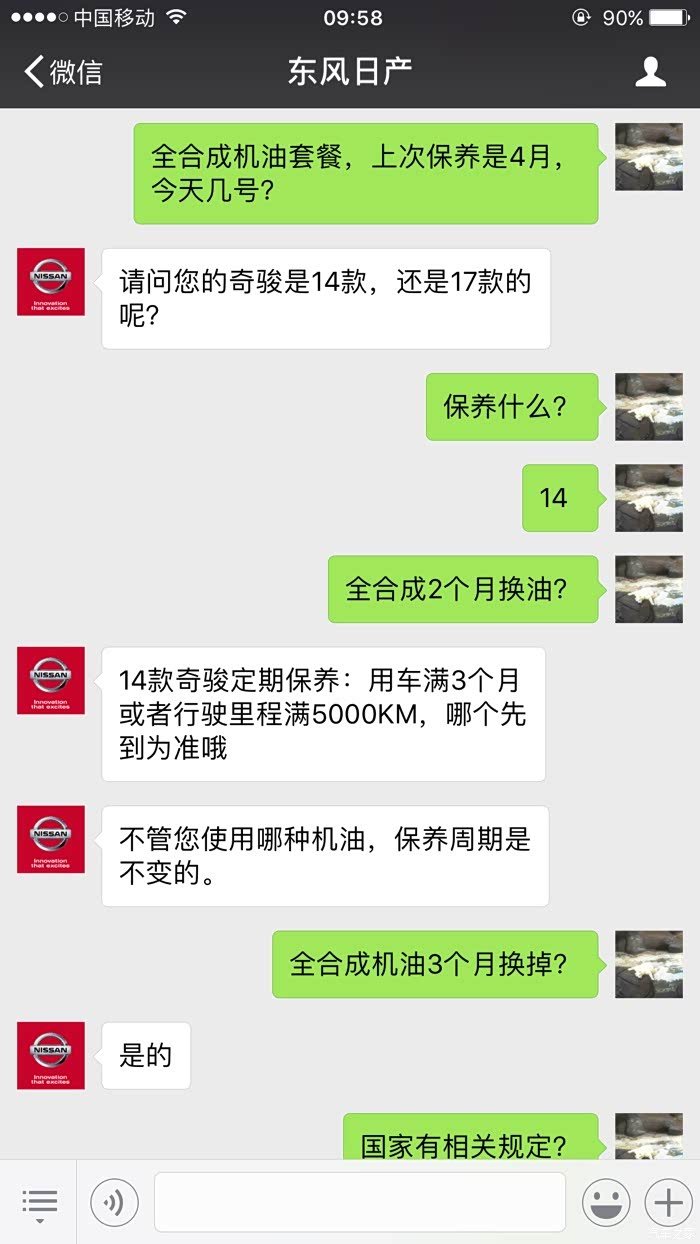 4月份选择了全合成机油套餐,今天是6月7日接到日产厂家的保养推送。随即联系东风日产客服,得到了神一样的答复,这就是技术日产,开日产车享受法拉利跑车的待遇,2个半月换机油。具体大家自己看,神逻辑。