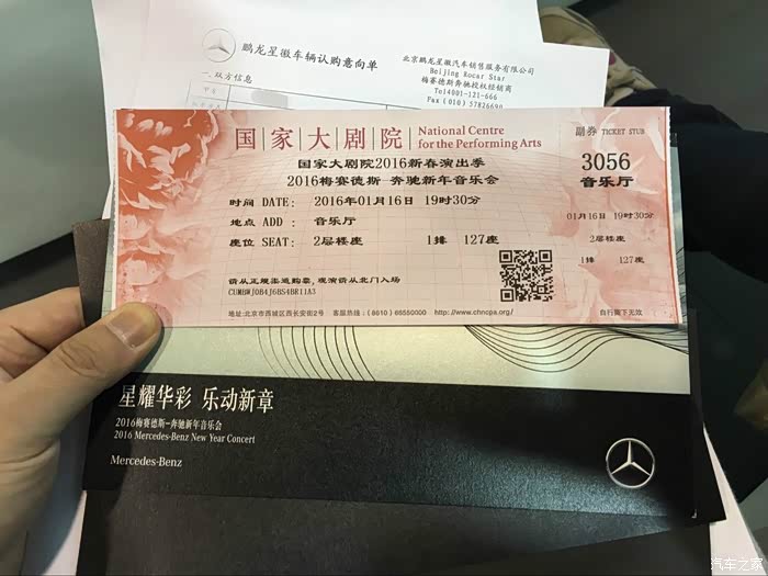 由于是第一个下订单的,汽车之家还赠送了我一张梅赛德斯奔驰新年音乐会门票