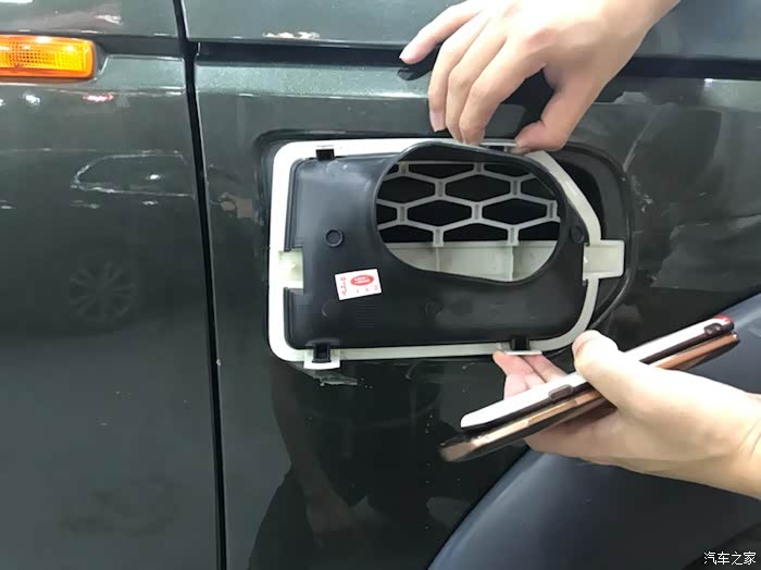 让大家看看 进气口 我是如何解决的 把原来的割大了 叫修理厂焊了一块铁皮上去 再从铁皮上割一个和发现4一样大的进气口