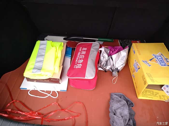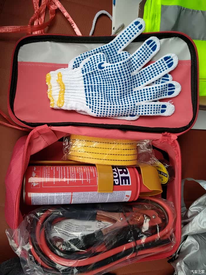 应急包:手套、拖车绳、电极线、小型灭火器。还有一包急救包,在书包里没拿出来。