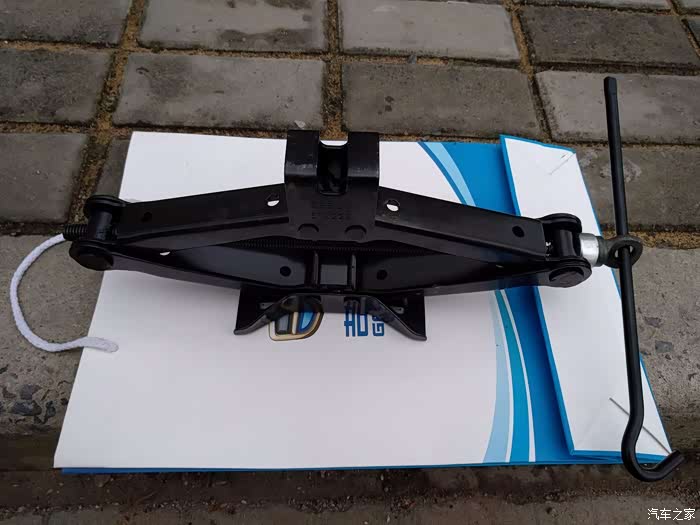 带上手套,拉开后备箱垫子,就看到了这些个工具:螺丝刀、摇杆、千斤顶、拖车杠、三脚架。