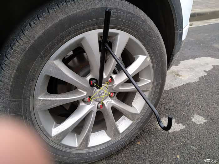 卸轮胎时,按照画五角星的顺序(图中1、2、3、4、5的顺序),挨个拆掉螺丝。没力气,没关系,上脚
