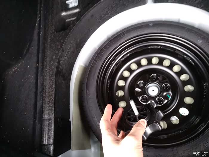 备胎用一个大螺丝固定着,黑色的八边形大螺帽。不是放在里面的,是螺丝固定着的!!虽然很大但我估计很多人会像我一样,没看到螺丝直接硬抬,车都拉动了,备胎没抬出来...尴尬,所以拉好手刹!!!