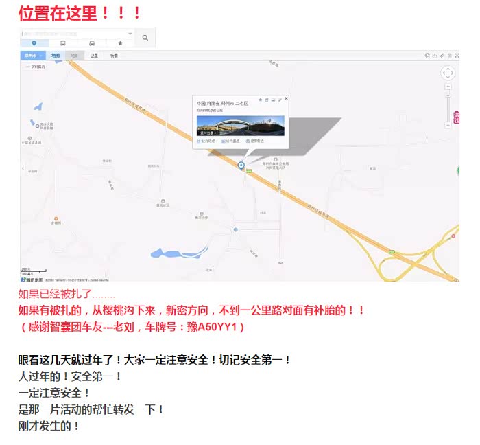 郑州的绕城基本3公里一个出口,非常方便。于是朝前开了不到2公里,从樱桃沟出口下了绕城。驶出出口时,顺便问了一下收费员,哪儿有补胎的。很激动,出去朝南,郑密路方向,路对面不到1公里有补胎的地方。