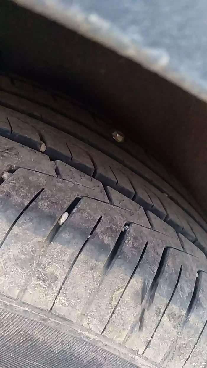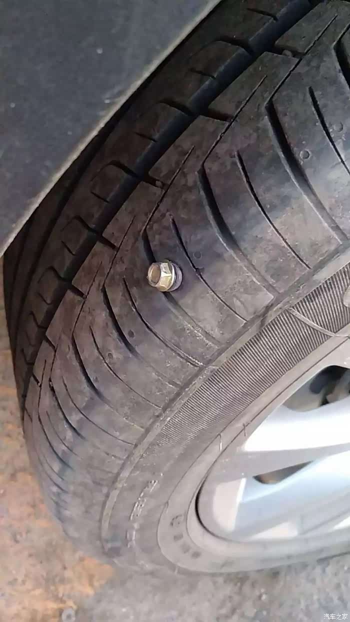 左边轮子中一个自攻丝已经扎入胎面。此处图片为驶出高速后在补胎处拍摄,高速危险,不要停车拍摄。
