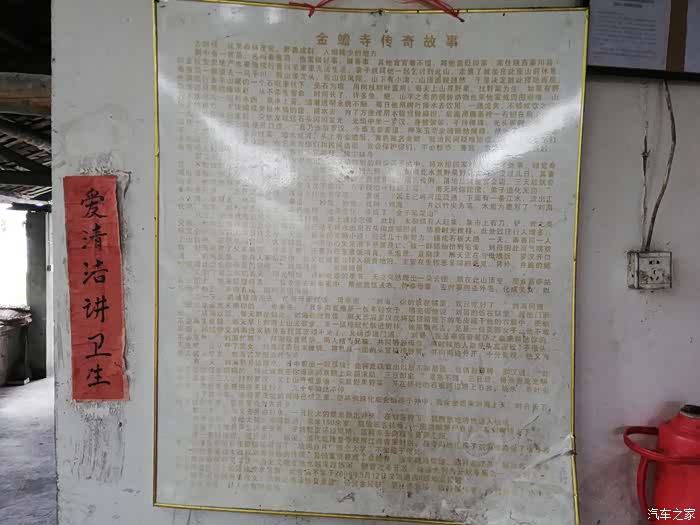 墙上挂着金蟾寺传奇故事的横幅,记录了金蟾寺的传奇色彩之说。