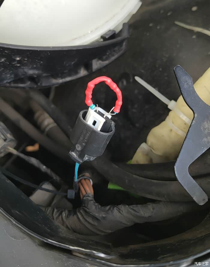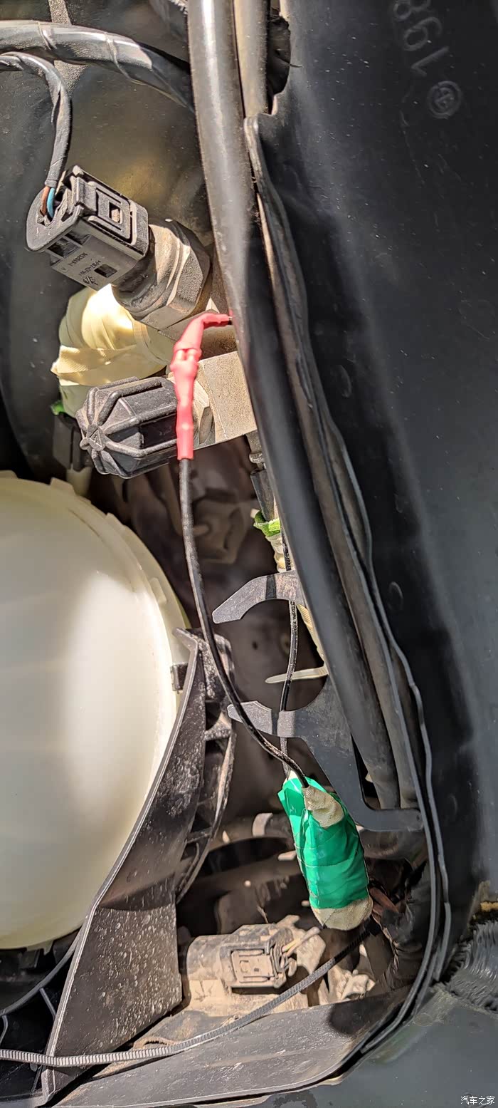 上图中,绿色部分是传感器插头,用耐高温的胶带包起来的电阻和插头,防水防高温。将其带固定在冷却液副水壶旁边,方便拆换。