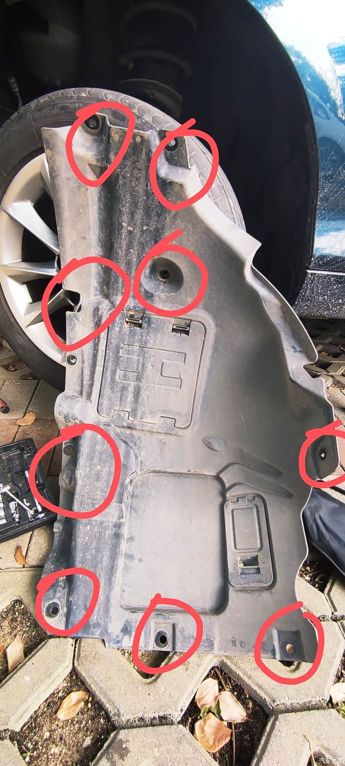 拆下前轮挡泥板的9个8毫米螺丝,红色圆圈就是螺丝位置