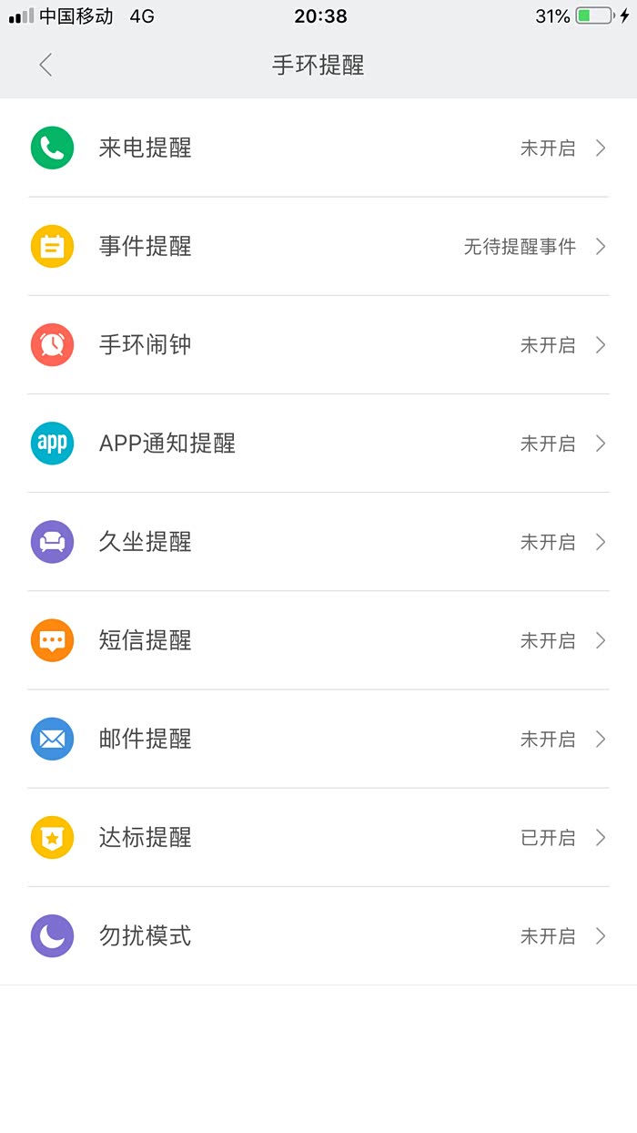 6 点进小米APP后,功能很多,比如闹钟,重要事件提醒,来电提醒,久坐提醒,短信提醒,勿扰模式,等等