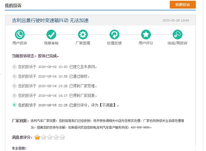 投诉品牌:-远景 投诉车型:远景手动幸福版 购买日期:2016年06月 所在城市:浙江省义乌市市 经销商名称:义乌市康大汽车贸易有限公司,厂家:浙江豪情汽车制造有限公司湘潭分公司 投诉内容:2016款吉利远景自动档,买来第二年就有挂档杆抖动,前进加油门缓慢的现场,当时对车子不懂,也没有在意,第二年怎么可能就有这些问题,我都以为是路面的原因。用了第4年就变速箱说坏就坏了,难道吉利一辆车的寿命就只有3-4年吗?我开的5万公里还不到。变速箱又不是其他零部件,它要是坏了整个车寿命就差不多了,而且2016款吉利远景普遍都是变速箱问题,一过保质期就坏,定时损坏。这次为什么要投诉,我也不是说什么,做好了自己自费维修的准备,因为在高速公路上突然出现前进挡开去不能提速,开着开着突然不能开动,停止了,吓出一身冷汗,这不是对我的人身生命安全构成巨大的危险吗?后来我赶紧熄火,再启动,只能前进,但是后退却不能,我手心都发凉,高速好多车子呼呼地过去。还好我的车子还能前进,如果要是不能前进或者启动,在高速公路上那是相当危险的,对消费者的生命安全构成了巨大的威胁,希望严查这款车的变速箱的质量问题,还消费者一个公道,我不想再有消费者在高速公路上出现生命威胁。后来回来去,检查,不能维修,只能更换,价格12000,我的车子才多少钱,才用几年,我用12000修一个出厂就有问题的变速箱,让我买单。我在高速公路上差点有生命危险,给我一个解释,不然投诉到底。希望严查问题,还消费者一个说法。后来在车质网投诉,车质网第一时间联系我,说给我联系厂家,厂家也没有打电话给我,4S店售后微信给我:投诉也没用,过保了只能自己维修,这算是协商的态度?车质网直接显示厂里处理完了。这也叫处理完了,打电话给我车质网客服,懒洋洋语气,听了就来气。吉利远景也不看看网上全是这款车定时损坏,都是今年集中坏,吉利车就只能用3-4年那质量堪忧啊,希望尽快帮我解决问题,要求免费更换全新变速箱!以免造成更大的事故或者危害我的生命安全。