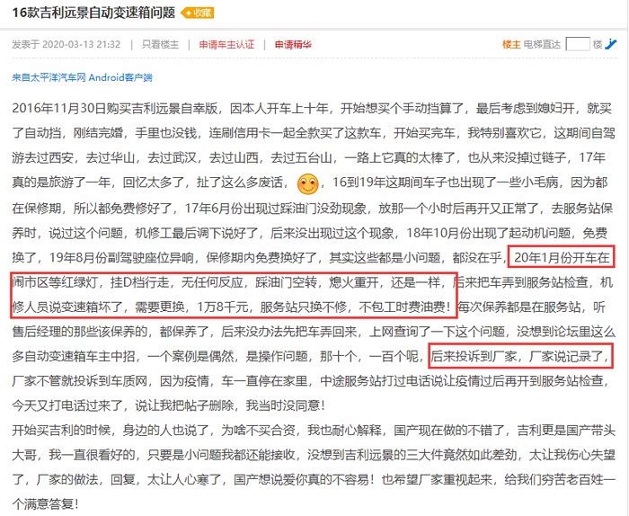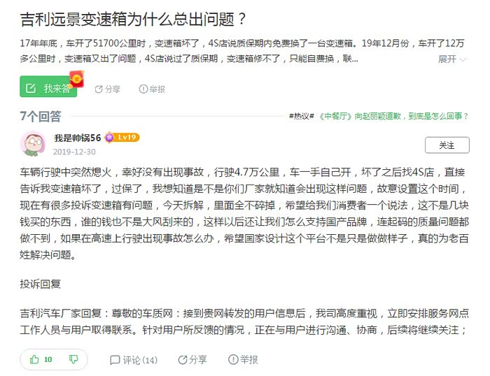 吉利远景变速箱严重质量问题,定时损坏,高速行驶,危害生命安全