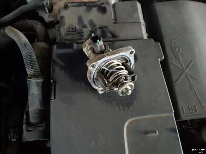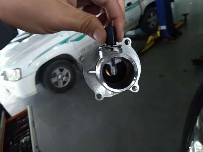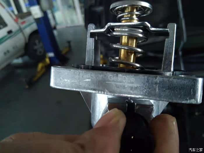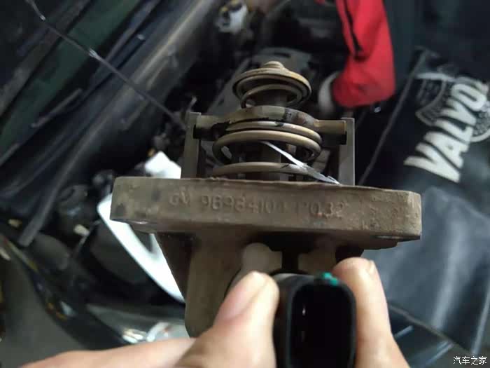 拆掉的节温器,手捏着的时传感器,不能单换传感器,要连节温阀一起换。