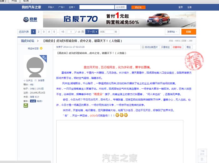 作为奇瑞车主,从在之家发帖开始,就对身边的事情多了一份关注,觉得论坛给了我们这些车主们一个平台去分享一些东西。男人都爱车,从14年就开始看车,到后来的提车,倒是认认真真的关注了奇瑞,这段时间忙很少发帖,但是还是一直在关注,之前看论坛的时候就看见突然冒出来好多人在喷奇瑞,关于外观,关于油耗,没打算说的,这种东西看一下就好了,现在感觉有愈演愈烈的趋势,所以实在是忍不住了出来说一下,自己作为车主,理应有自己的立场。