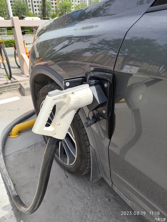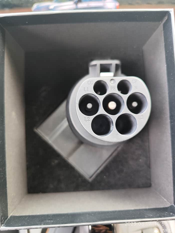 8月18日,售后顾问回复我说转接头到店了。时间都是刚刚好,8月19日又是周六,早上带着儿子9点准时到4S店,10点30分通知我都升级完成,拿上转接头后,立马找了个附近的小桔充电桩体验转接头。转接头不重,单手拿不费劲,安装简单方便。
