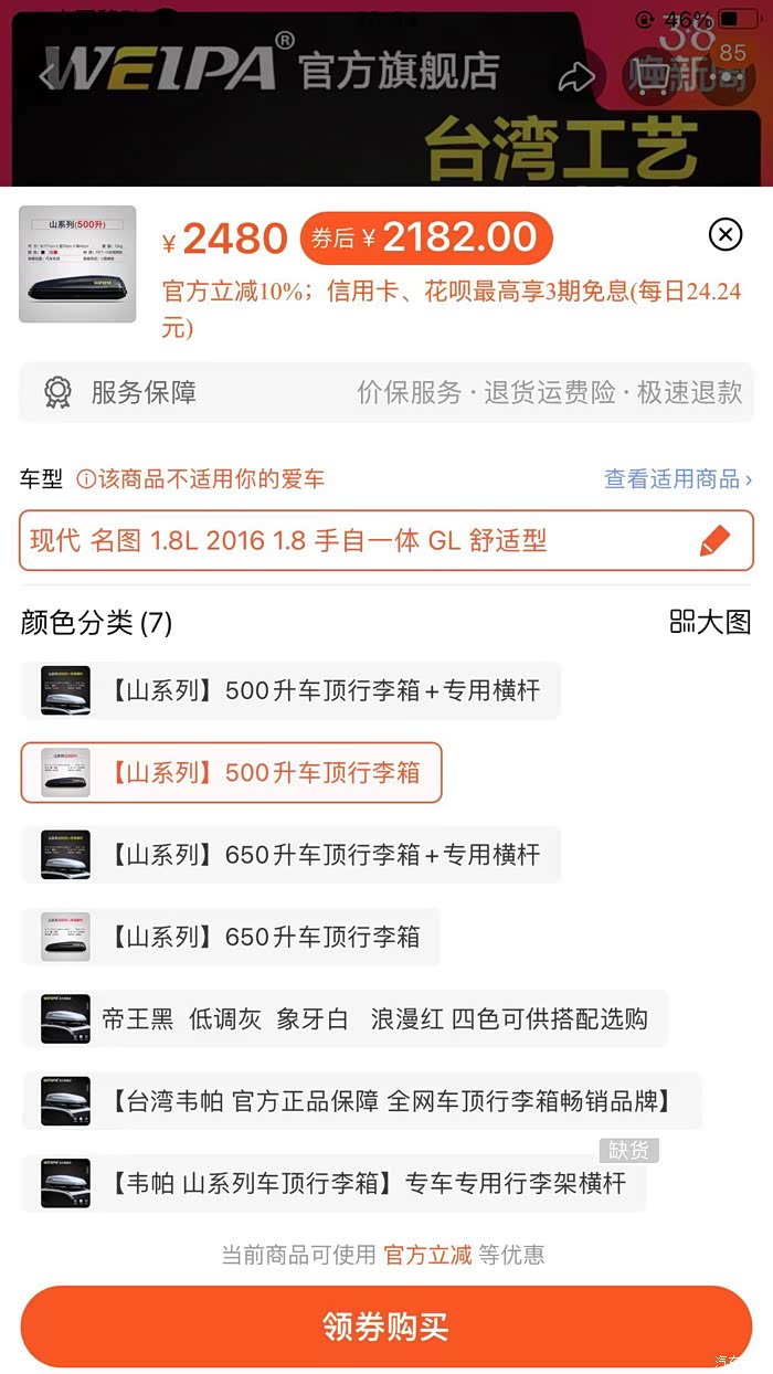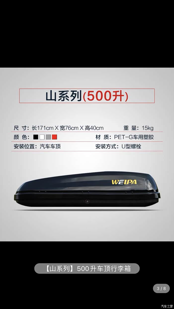 以比较优惠的价格 买到了一个韦帕 山系列500升 白色的车顶行李箱 可以双侧开启 然后购买横杆 把它装上去 长途旅行 放手提行李箱 或者其它物品 也比较方便实用。