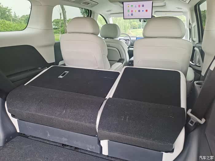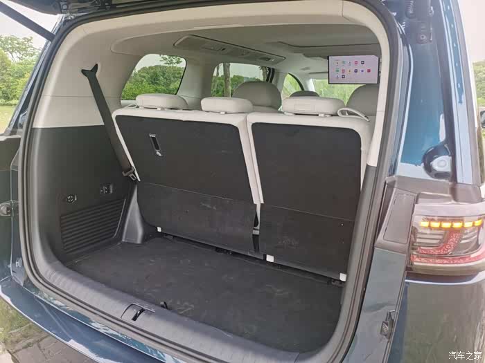 空间方面,前排驾驶位调整到舒适坐姿后,后排乘客即便是翘起二郎腿也毫无压力,第三排也空间也很充裕,并且座椅可以电动前后和靠背调节,我身高 178cm 坐在后排,头部和腿部都有足够的余量,完全不会觉得憋屈。车内的储物空间也十分丰富,除了常规的门板储物格、中央扶手箱外,座椅下方还隐藏着不少储物暗格,方便收纳一些小件物品。后备箱容积更是惊人,在满座状态下,轻松装下 3-4个24寸行李箱不在话下,第三排座椅还能按比例进行放倒,空间就更大了。