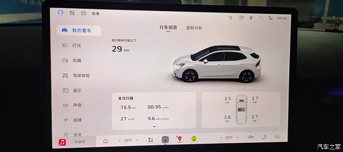 第一天通勤电耗,西安市二环环线10公里左右,市区道路5公里左右,通风2档,早上天凉未开制冷,单人单车,市区道路普遍限速70公里,加上早上堵车,均速27公里,这个电耗还可以吧。