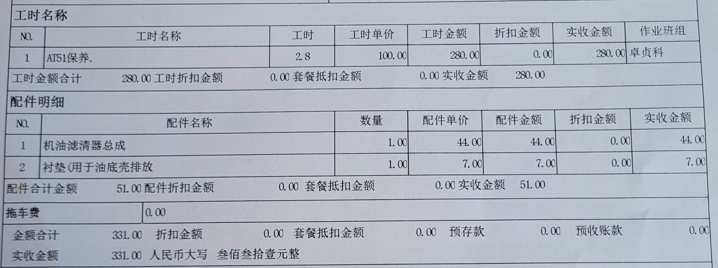 此次常规保养一共331元。