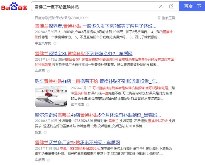 在网络上输入“雪佛兰一直不给置换补贴”关键词会看到很多网友在咨询相关问题,约有“2,800,000”个。