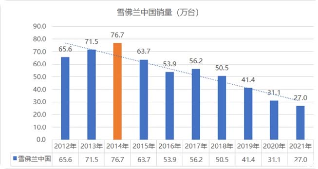 从2005年意气风发入华,到2014年的销量巅峰,当年的雪佛兰也是顺风顺水,然而,往后销量突然急转而下,到2020年全年销量仅为28.03万辆,2022年更是跌到了20万辆。
