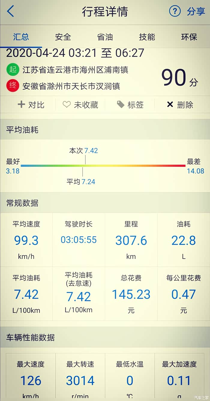 最高油耗的一段路程,速度很快,耗油也高,平均油耗百公里7.42升,行驶里程307.6公里,平均速度每小时99.3公里。
