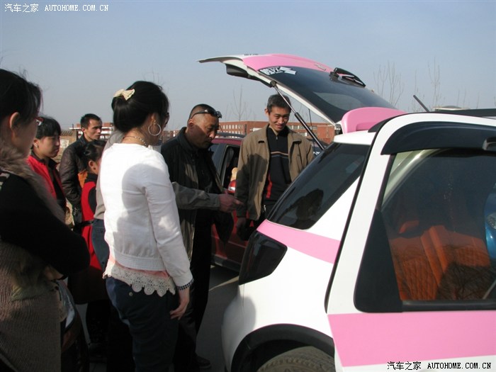 猜猜大家在围观啥?这就是之前说的那辆粉白天语,可以看到,全车座椅是橘红色真皮座椅,不带套不带垫,四轮全白…但是大家仿佛对座椅不感冒了,又在围观的是后备箱耶: