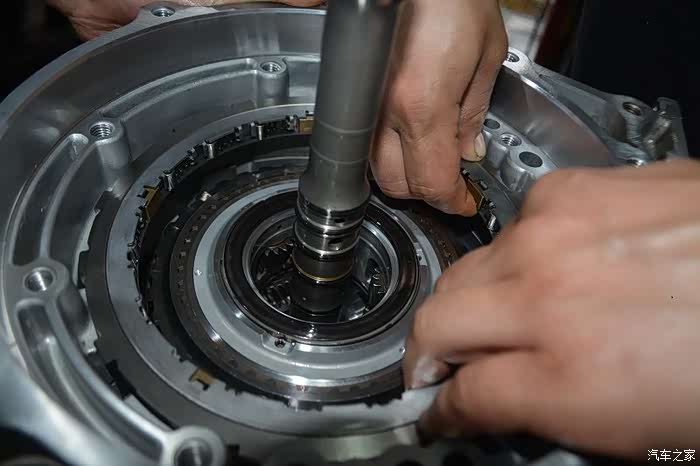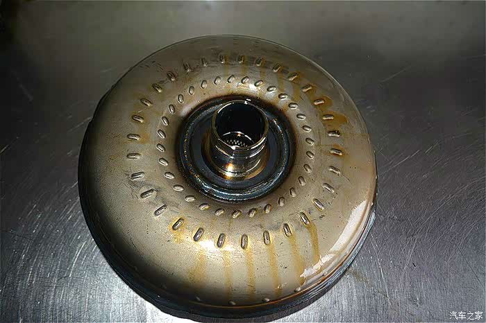 英菲尼迪Q50S手自一体7AT变速箱正面大脸照。中间圆圆的是变速箱的液力变矩器(大力鼓),它起到一个传递动力、变矩、离合的作用。