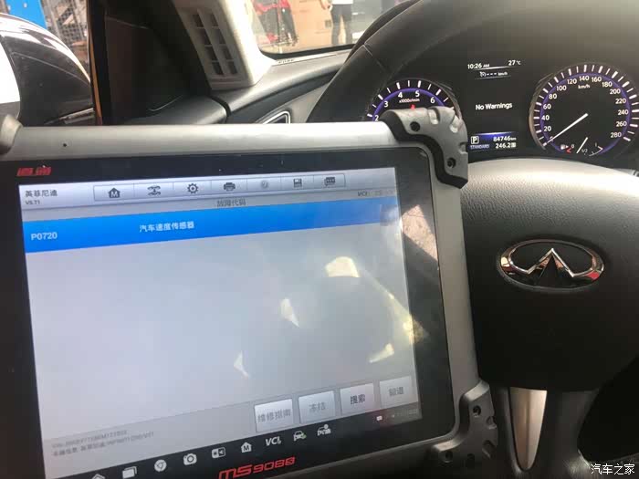 来到这里检查一下,看看到底哪里坏了,维修师傅用解码器检测有故障代码P0720 汽车速度传感器故障 维修师傅初步判断为是变速箱内部电脑板损坏导致的,具体损坏详情还需要拆开看看。