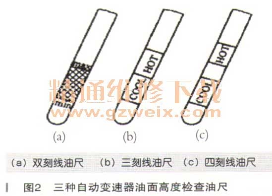 ①油耗尺检查方法。油尺有双刻线、三刻线和四刻度线三种,如图2所示。