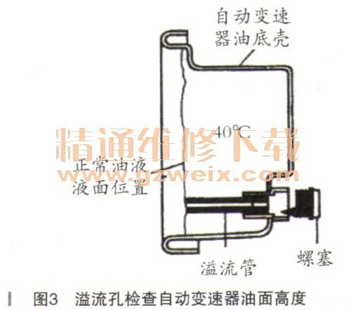 ②溢流孔检查方法。部分车型没有设计自动变速器油液液面高度检查尺,而是在自动变速器油底壳上设一溢流孔,图3为波罗(POLO)轿车001型自动变速器用于检查油液液面高度溢流孔。溢流孔平时用螺塞拧紧,检查油液液面高度时将车辆水平停放,保持发动机怠速运转至正常工作温度,将变速杆分别置于各个挡位停留片刻,然后将变速杆置于P挡或N挡,拧开螺塞,如果有少量油液溢出即为合适。例如:大众系列01N、001、01M型自动变速器规定在35~45℃时溢流孔刚好有ATF油液流出为正常。