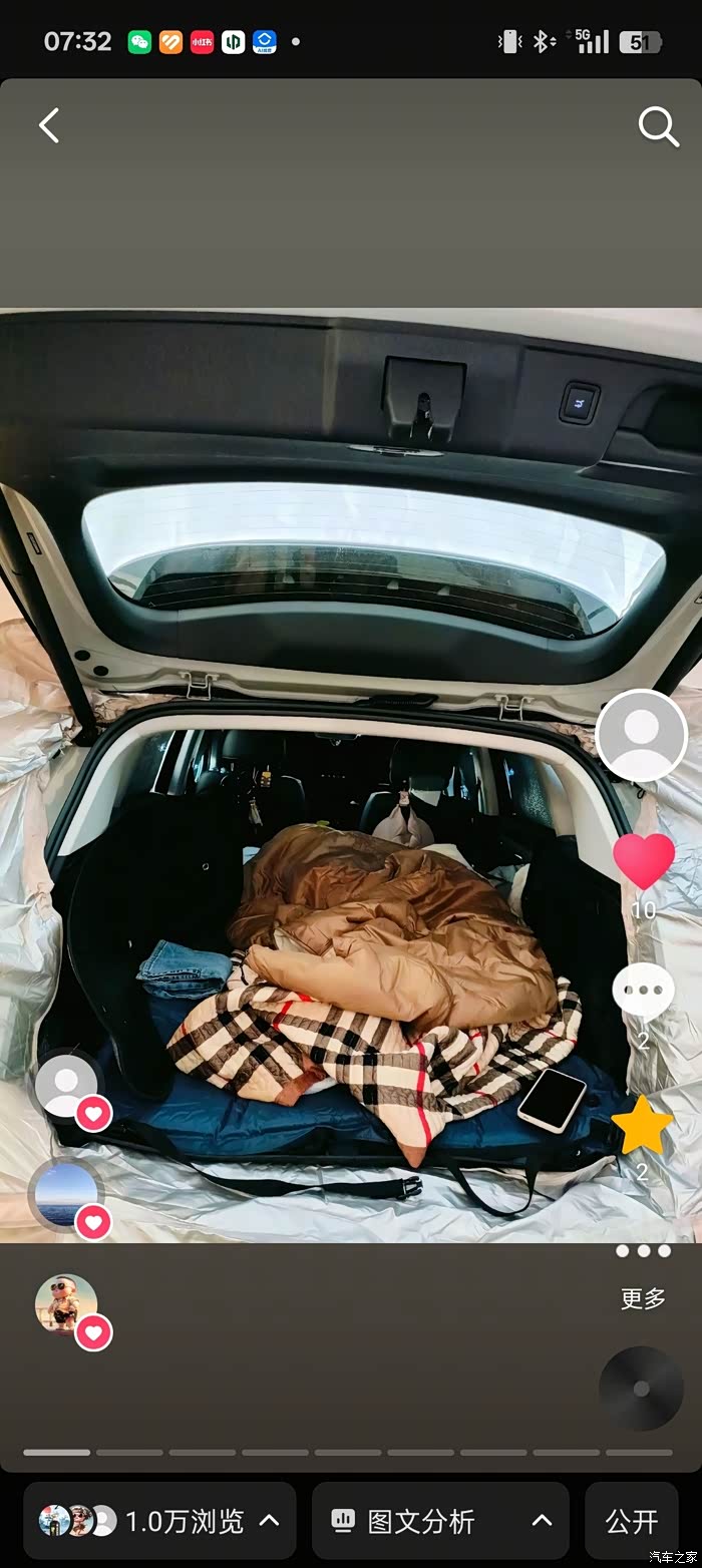 上周末去露营,我的 C10 成了全场最实用的装备。它的外放电功能(最大 3.3kW)可以同时给电烤盘、咖啡机、投影仪供电,朋友们都羡慕得不行!后备箱塞下全套露营装备,后排座椅放倒后还能变成 1.8 米的大床,配上定制的充气垫,晚上躺着透过全景天窗看星星,比帐篷舒服多了。
