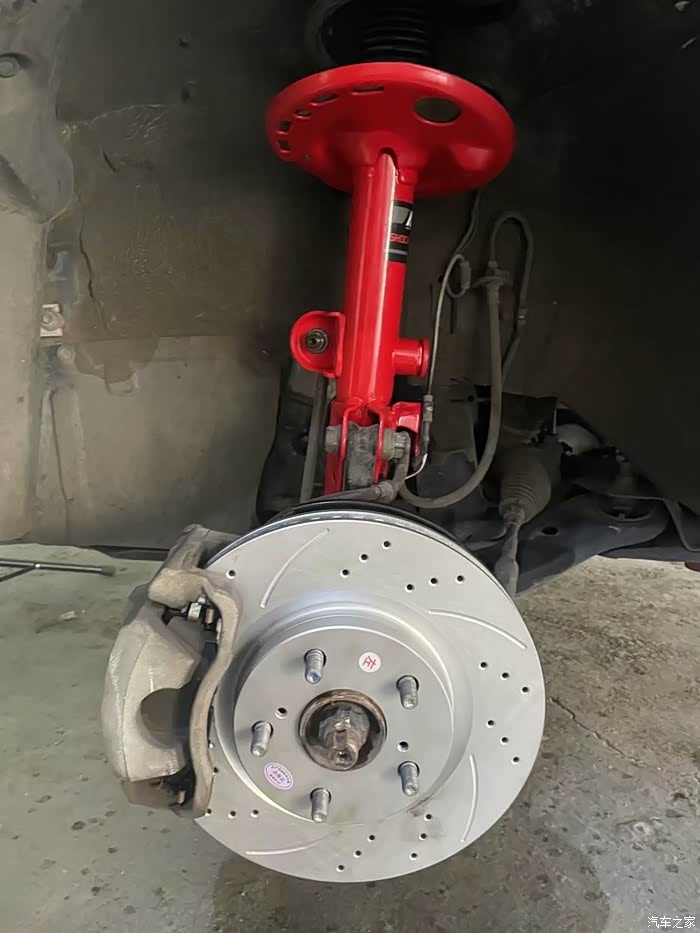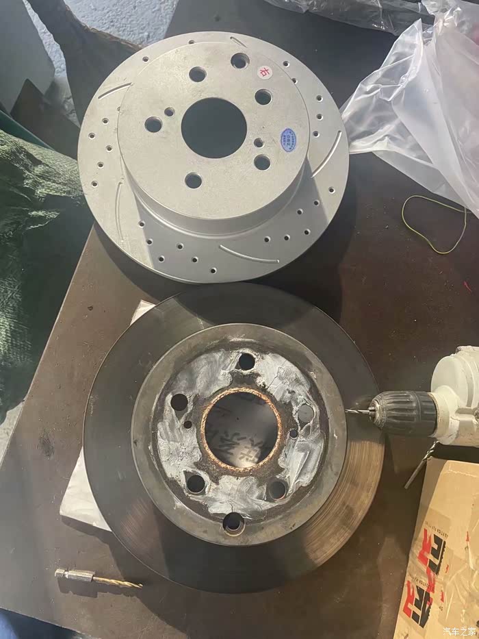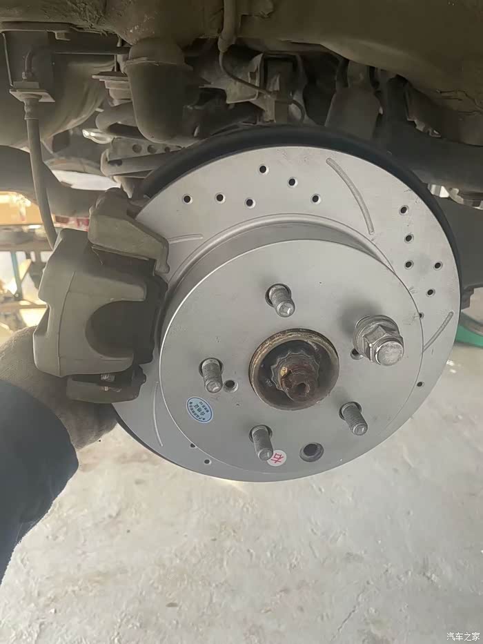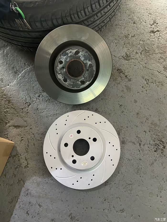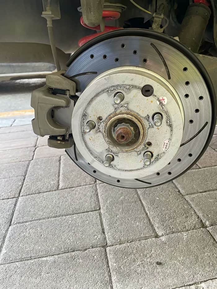 4.更换了前打孔划线透风盘、后打孔划线实心盘,原车尺寸原车空位直接更换,更换了碳陶刹车片,原车位置直接更换。经过3000km测试,目前感觉很好,特别是在青岛多坡路段,连续踩了很多脚之后,前车突然刹车,我一脚重刹,响应非常好,瞬间刹死(40km左右),说明热衰比原来的刹车盘要小很多了,之前总说Toyota站不住,其实不是站不住,是Toyota的刹车热衰比较厉害,所以下坡多踩几脚后,就容易刹车效能降低。