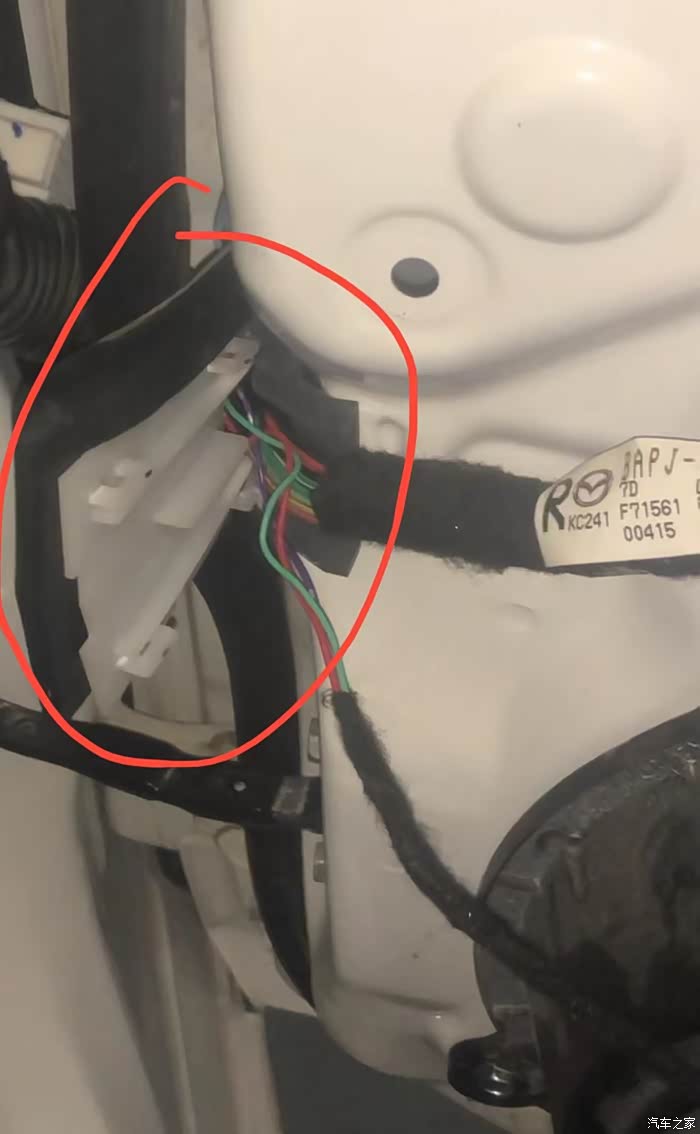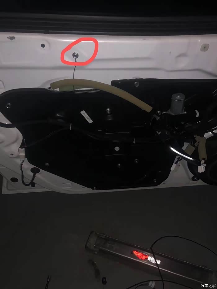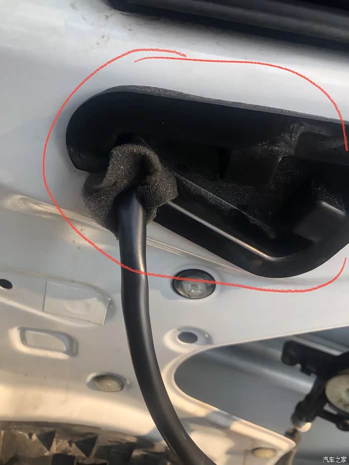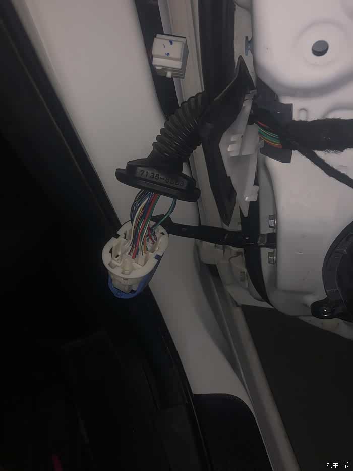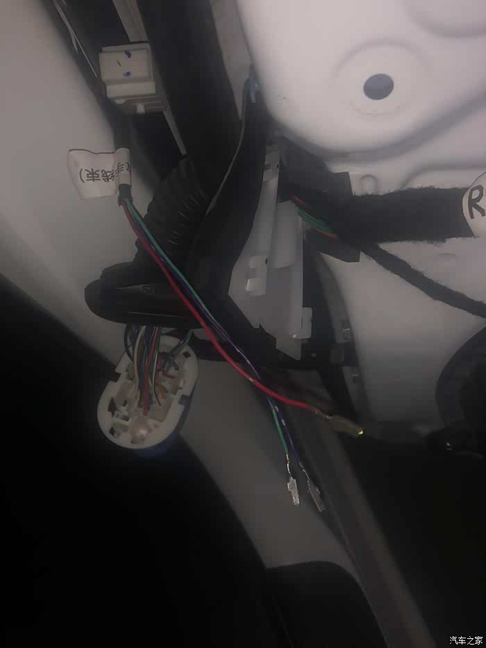 下面的线头需要从下方的圆洞里走出来,并且要把胶皮固定好在圆洞上,把插口固定在卡位上。装回隔音板并装上所有的螺丝,插上所有线束,地线接在最上方螺丝处。准备走线(驾驶侧门板拆卸流程一样)。