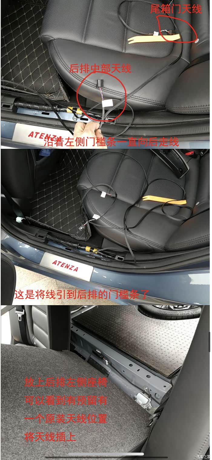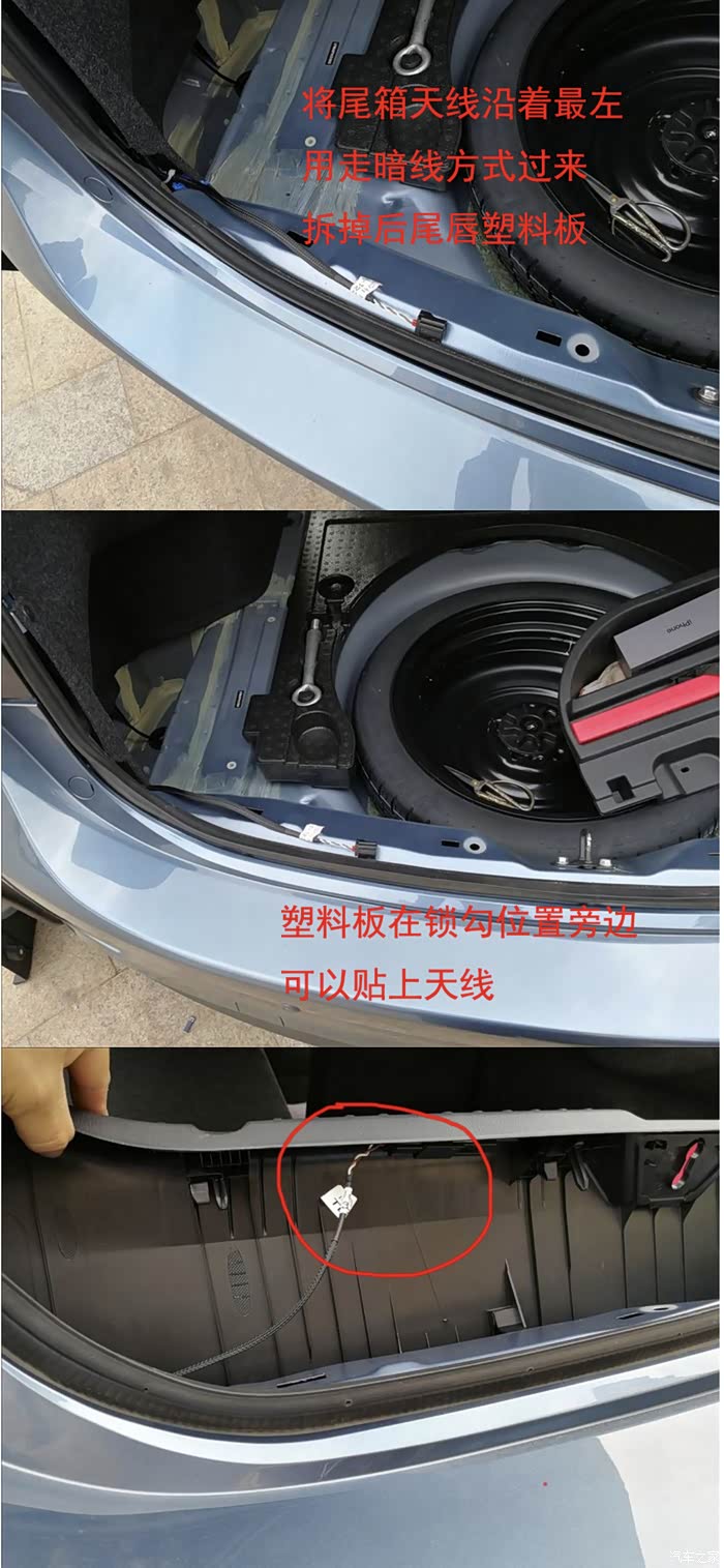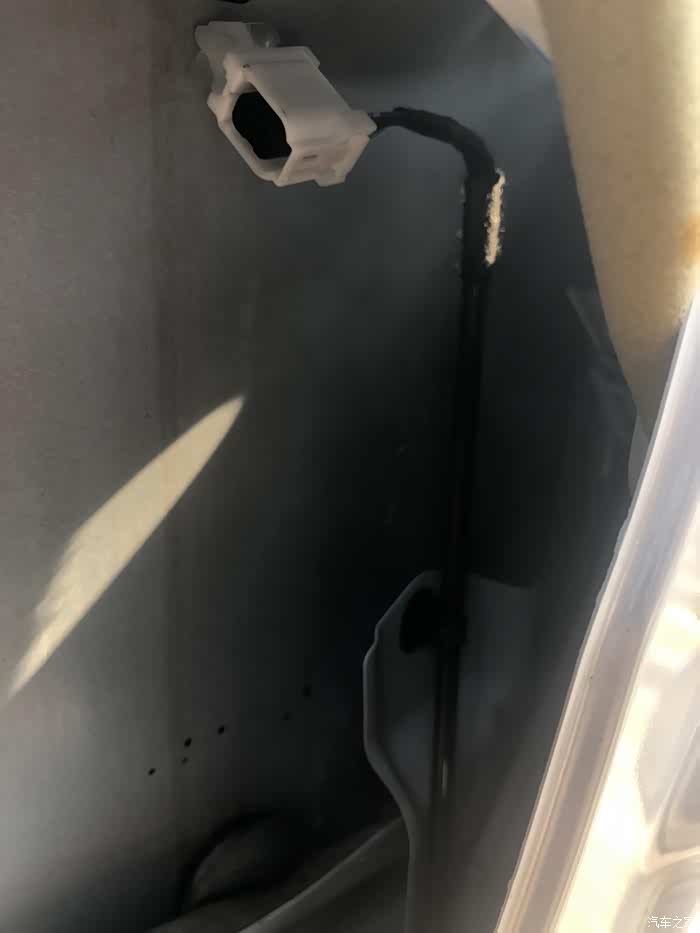 后备箱的信号天线只能靠魔术贴粘在塑料板上。所有的线走完后我们需要接左右门板的控制线。