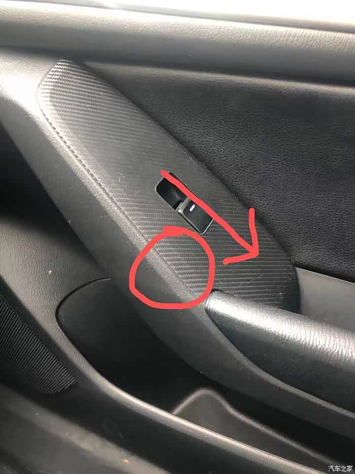 首先要把拉手里的那个塑料片抠出来,这样就能取掉第一颗螺丝,接着把扶手坑里面的胶皮垫取掉,就看到第二颗螺丝(这里很简单没有拍图),把螺丝取掉后我们需要把玻璃升降开关取下(在此之前确保车窗处于关闭状态)。