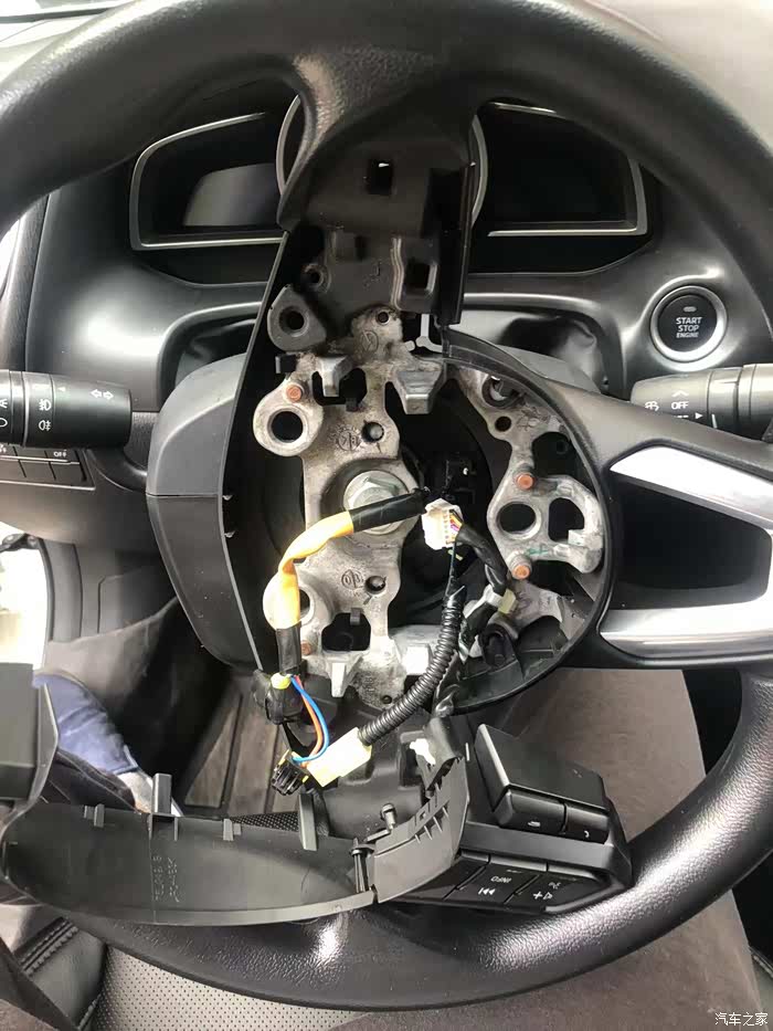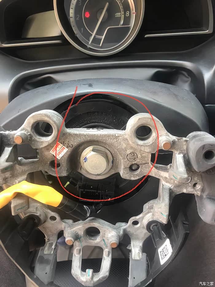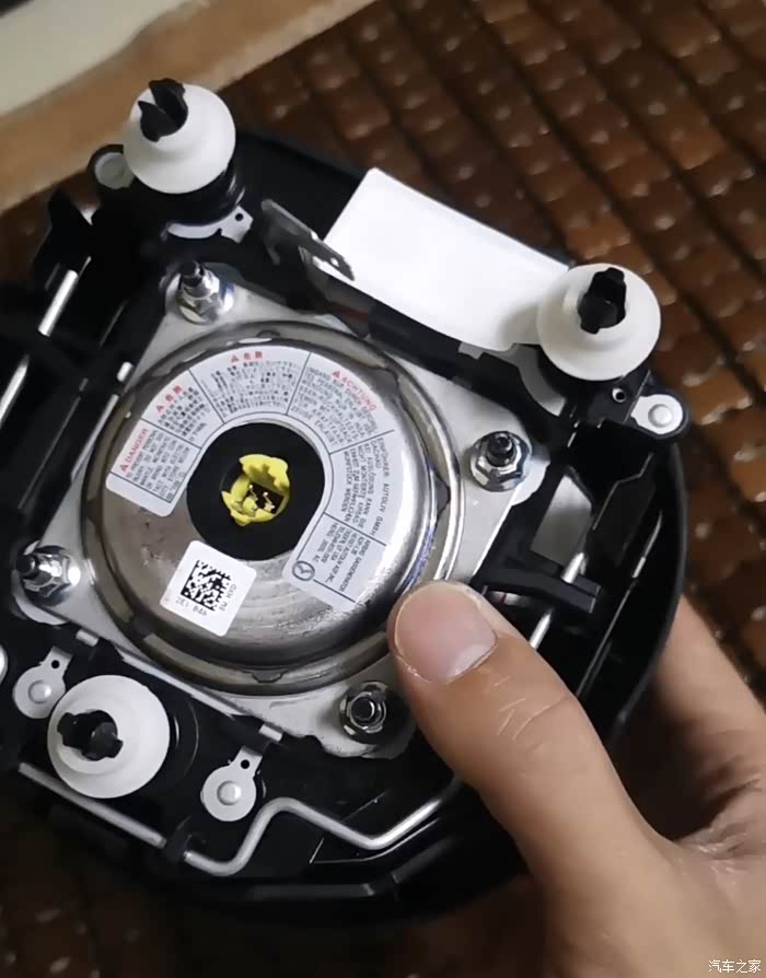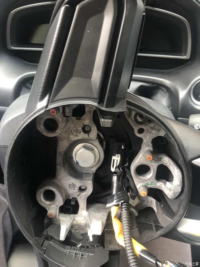 气囊拆卸大家可以百度,有视频教程,要从方向盘后面用长六棱扳手捅出来,不太好拍照,后面的洞分别在方向盘的9点,3点,和6点的位置,先把3点和9点的位置顶开,最后顶6点的位置,需要有耐心,注意:捅的时候要熄火。