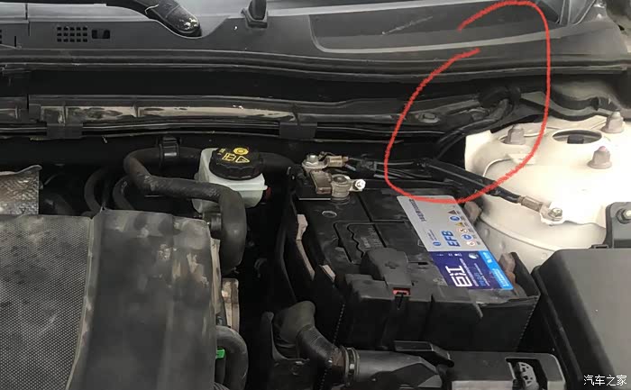 按照孔位装好蜂鸣器后,把刚才拉上来的蜂鸣器线按照图上的位置从驾驶侧雨刮防水板下走线到蜂鸣器上插好,然后装好防水板,电池。