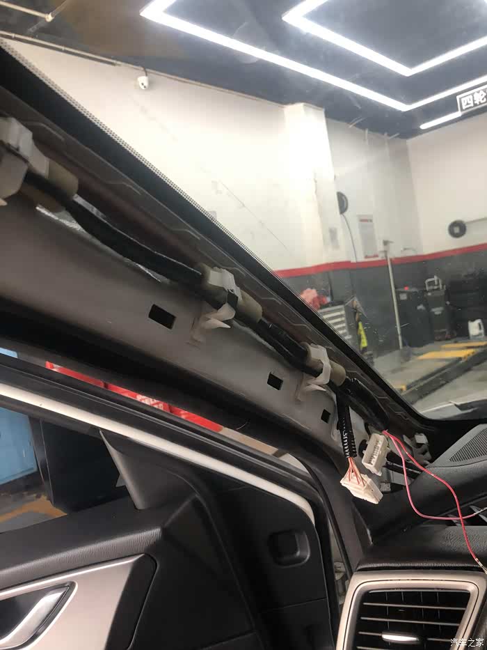 然后我们把原厂的红线和粉线走好位置(从车顶一直走到A柱)准备补线。